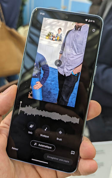 Mais avant cela, remarquez que le Pixel 8 Pro embarque des fonctionnalités d’édition poussées par l’intelligence artificielle permettant de retoucher les photos directement sur le mobile. Il est ainsi possible d’améliorer l’éclairage et l’arrière-plan tout en pouvant détourer les sujets pour les déplacer sur l’image. Si l’un des sujets de vos photos ne sourit pas, la fonction Meilleure prise combine plusieurs photos similaires dans une seule image pour que tout le monde soit à son avantage. En outre, on peut également compter sur la fonction Gomme magique audio. Celle-ci, après avoir tourné une séquence vidéo, donne la possibilité de jouer sur les niveaux des voix, du bruit de fond ou de la musique. C’est l’utilisateur qui décide d’augmenter ou de diminuer l’un des trois éléments pour un rendu vraiment personnalisé. On peut ainsi se concentrer sur la voix ou sur la musique alors que dans la réalité, il y a, par exemple, beaucoup de bruit parasite. Bien entendu, nous ne manquerons pas de tester ces fonctionnalités afin d’évaluer leurs pertinences et leurs performances, mais à priori, les premières démonstrations auxquelles nous avons pu assister semblent particulièrement prometteuses.