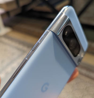 Sur le profil droit, il y a le double bouton qui permet de gérer le volume et, un peu plus haut, comme sur le précédent, le bouton pour mettre en veille (ou appeler l’assistant vocal). Ceux-ci sont très légèrement plus rapprochés l’un de l’autre par rapport aux boutons du Pixel 7 Pro. Rappelons que les Pixel sont les seuls du marché à proposer cette organisation, tous les autres fabricants ayant opté pour l’inverse : le bouton de mise en veille le plus bas et, au-dessus le bouton pour gérer le volume. Sur le profil gauche, il y a le tiroir à cartes SIM. Le mobile supporte la technologie eSIM pour une carte de communication dématérialisée, mais qui a bien du mal à trouver des adeptes en France alors que c’est monnaie courante aux États-Unis, par exemple.