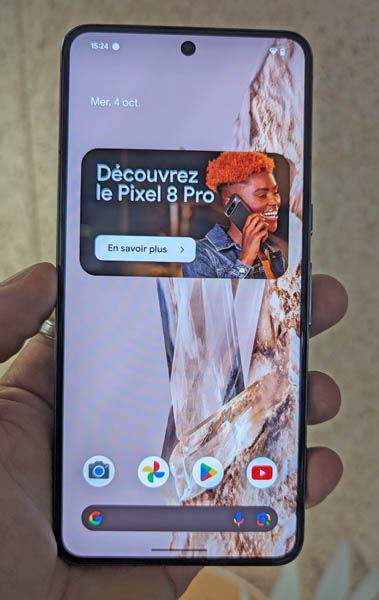 Pour le Pixel 8 Pro, Google propose une surface d’affichage de 6,7 pouces sur une dalle AMOLED avec une définition de 1440x3120 pixels compatible avec le format vidéo HDR10+. Malheureusement, il ne supporte pas le format Dolby Vision, pourtant plus utilisé par les plateformes de streaming, mais aussi soumis à une licence. Officiellement, Google annonce une luminosité maximale de 2400 cd/m², ce qui en fait l’un des plus lumineux du marché.