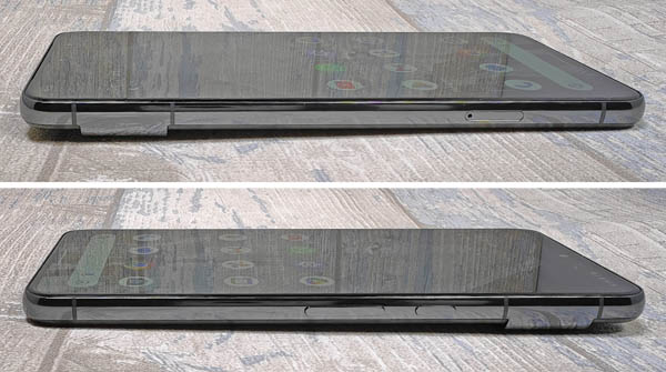 Lorsqu’on fait le tour de l’appareil, on peut voir que le bouton volume est toujours en dessous du bouton de mise en veille, installés tous les deux sur le profil droit. C’est une façon de se différencier des autres mobiles du marché qui proposent tous ou presque une organisation inversée par rapport aux mobiles Google. Les boutons sont placés suffisamment bas pour que cela ne gêne pas. D’autre part, en saisissant simplement le téléphone, cela réveille son écran révélant le lecteur d’empreinte digitale qui est installé dessous pour poser son doigt dessus. Exactement comme sur le Pixel 7 Pro, le lecteur est situé à environ 3,5 cm du bord inférieur du smartphone, ce qui est une position idéale, selon nous. Cela évite une gymnastique du pouce pour poser le doigt dessus.
