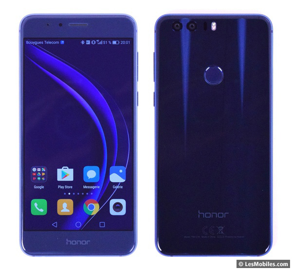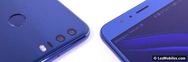 Premium, le Honor 8 l'est tout d'abord par son design. Comme indiqué plus tôt, c'est le point qui l'éloigne le plus de son cousin signé Huawei. Cela ne l'empêche pas pour autant de ressembler à d'autres smartphones. Pour la comparaison, et au risque de titiller nos lecteurs anti-Apple, nous le rapprocherions des iPhone 6 pour ses formes arrondies même si les matériaux sont différents. Nous ne trouvons ici du métal que sur le cadre alors que l'arrière est couvert d'une vitre 2,5D. Le résultat, bien que salissant et glissant à la pose, est agréable à l'oeil et même de toute beauté avec notre coloris bleu. Deux autres sont pour rappel proposés : noir et blanc.