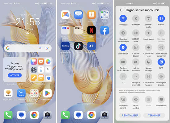 La barre des fonctions raccourcis est particulièrement étoffée avec de nombreuses possibilités. On peut ainsi personnaliser les options disponibles. Les paramètres sont toujours aussi bien organisés et permettent de gérer entièrement le mobile avec un maximum de précision pour qu’il réponde aux besoins de tous les utilisateurs aussi bien en termes de sécurité que d’interface. On peut accéder aux services Google ainsi qu’à la plateforme Google Play Store et y télécharger toutes les applications souhaitées. L’interface est hautement personnalisable. On apprécie la possibilité de créer de grands dossiers sur les pages d’accueil permettant de voir toutes les applications qui y sont regroupées.