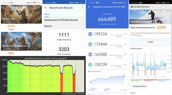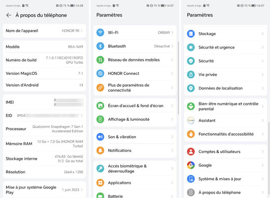 Le Honor 90 est animé par Android en version 13 avec une surcouche Magic UI 7.1. La mise à jour de sécurité de notre modèle de test au moment de l’écriture de ces lignes et la mise à jour Google Play dataient du 1er juin pour des tests réalisés courant juillet, ce qui est assez récent. Honor promet 2 ans de mises à jour pour Android et 3 ans de mises à jour pour la sécurité.