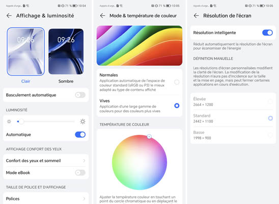 Dans les paramètres, il est possible de choisir entre deux schémas de couleur : normales ou vives, avec la possibilité de jouer sur la température de couleur pour obtenir une teinte plus chaude ou plus froide. Les réglages proposés par défaut sont tout à fait satisfaisants. L’appareil propose trois définitions pour son écran : 900x1998, 1100x2442 ou 1200x2664 pixels, avec pour ce dernier, une consommation légèrement supérieure aux deux autres, mais proposant une meilleure lisibilité. Il est toutefois possible de régler le paramètre sur Résolution intelligente pour que ce soit le système qui gère la meilleure définition pour obtenir la meilleure autonomie. Disposant d’une dalle qui peut faire varier sa fréquence de rafraîchissement entre 60 et 120 Hz, on peut régler le paramètre sur le mode dynamique qui va choisir la fréquence la plus adaptée ou sur l’un des autres modes : élevé (120 Hz), moyenne (90 Hz) ou standard (60 Hz) auquel cas, la fréquence est bloquée.