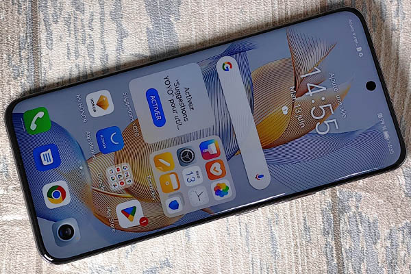 Comme les modèles les plus haut de gamme à l’image du Magic5 Pro, par exemple, le Honor 90 profite d’une surface d’affichage ayant les 4 côtés incurvés. Cela permet de faciliter les gestes pour naviguer dans les menus et donne l’impression que l’écran n’a pas de bord. Pour ne rien gâcher, nous n’avons pas constaté de dérivé chromatique, ce qui peut parfois être le cas sur certains écrans. Les bords sont donc extrêmement fins et on a droit à une très belle impression d’immersion. L’écran fait 6,7 pouces en diagonale. Il est compatible avec le format vidéo HDR10+ pour les plateformes qui le proposent permettant de parfaitement gérer les zones sombres et les parties claires de l’image pour ne louper aucun détail. Honor annonce une luminosité maximale de 1600 cd/m², ce qui est particulièrement élevé. À titre de comparaison, la luminosité maximale du Motorola edge40 est de 1200 cd/m² alors que celle du Samsung Galaxy A54 5G est de 1000 cd/m² contre 900 cd/m² pour Redmi Note 12 Pro Plus.