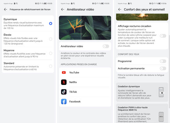 Une fonction d’amélioration des vidéos est disponible pour les applications la supportant (YouTube, Netflix, TikTok, Facebook, etc.). Comme sur les autres smartphones, la caméra à selfie étant située tout en haut de l’écran, ici derrière un poinçon, il est possible de modifier l’affichage pour profiter de toute la surface ou seulement une partie.