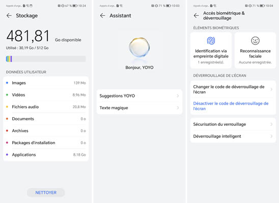 L’interface est familière avec plusieurs applications préinstallées ainsi que les applications Google et certaines signées Honor. Les applications préinstallées sont : App Market, Booking.com, Facebook, Game of Sultans, Lords Mobile, Netflix, Prime Video, TikTok, TrainPal, Trip.com et WPS Office. Celles-ci, avec le système, occupent un peu plus de 30 Go sur les 512 Go théoriquement disponibles. C’est dans la moyenne basse, comparée à la concurrence.