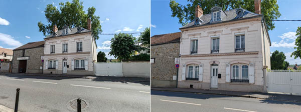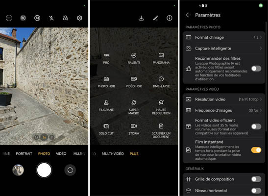L’interface de l’application Appareil photo propose plusieurs options en haut de l’écran. Dessous, il y a la zone de cadrage et plusieurs niveaux de zoom sont immédiatement disponibles au-dessus des différents modes de prise de vue : 0,6x, 1x ou 2x. Plusieurs modes sont immédiatement disponibles : Ouverture, cliché nocturne, portrait, photo, vidéo, multi-vidéo et Plus qui permet d’accéder à d’autres modes : Pro, Ralenti, Panorama, Photo HDR, Vidéo HDR, Time-lapse, Filigrane, Super macro, Haute résolution, Solo Cut, Storia et Scan de documents. Ces derniers modes peuvent rejoindre les autres pour une interface plus personnelle. Les portraits peuvent être réalisés avec le capteur principal.