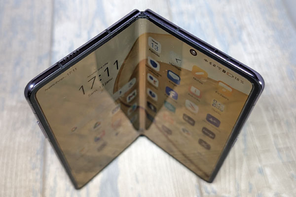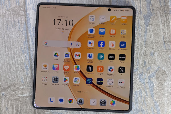 Les deux mains sont nécessaires pour ouvrir l’appareil. Cette robustesse permet de pouvoir tenir l’un des volets ouverts à 90 degrés, voire plus. C’est un avantage pour profiter des vidéos, par exemple. Officiellement, Honor annonce qu’elle peut résister à plus de 400 000 cycles de manipulations avant de montrer les premiers signes de faiblesse. Sans avoir été jusque-là lors de nos tests, nous devons saluer la très bonne tenue de ce mécanisme.