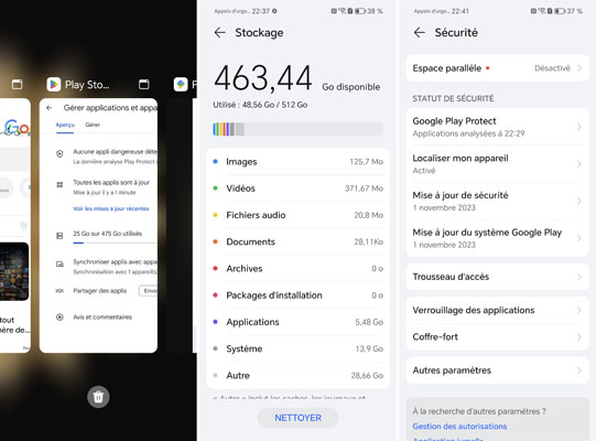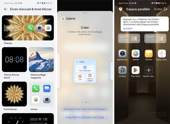 Une fonction Espace parallèle est intégrée. Celle-ci permet de protéger les applications et documents que l’on souhaite puisqu’une empreinte digitale ou un code est demandé pour y accéder.