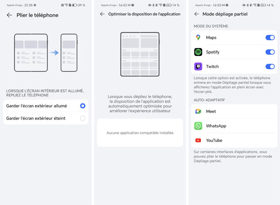 Enfin, modèle pliant oblige, un menu spécifique est prévu. Baptisé Téléphones pliables, il permet de choisir si on veut garder l’écran externe allumé lorsqu’on est passé à l’affichage sur l’écran interne (ou pas), de sélectionner un format d’affichage pour chaque application (plein écran, 4/3 ou 16/9) ainsi que de gérer les extensions d’application. Un mode Dépliage partiel est proposé. Il s’agit d’une option qui permet d’afficher l’application en plein écran avec l’écran plié.