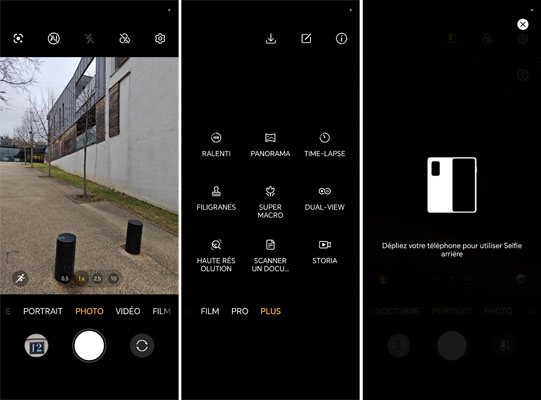 L’interface de l’application diffère légèrement si on utilise l’écran externe ou celui qui est à l’intérieur de l’appareil. Les paramètres sont disponibles en haut à droite. Dessous, il y a la zone de cadrage avec, un peu plus bas, les niveaux de zoom 0,5x, 1x, 2,5x et 10x. Les modes photos immédiatement disponibles sont : Ouverture, Cliché nocturne, Portrait, Photo, Vidéo, Film, Pro et Plus. Dans ce dernier menu, on trouve les modes Ralenti, Panorama, Time-Lapse, Filigrane, Super Macro, Dual-View, Haute résolution, Scanner de document et Storia. Il est possible de les extraire pour les faire apparaitre au niveau de l’interface principale pour un accès plus rapide. Si on utilise l’écran interne, les options sont reparties sur les côtés gauche et droit avec les niveaux de zoom à 0,5x, 1x et 2,5x et 10x. Dans le coin supérieur à gauche, il est possible d’activer l’aperçu des dernières photos prises. C’est très agréable et pratique, à l’usage.