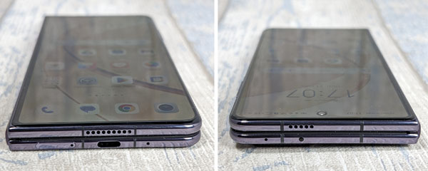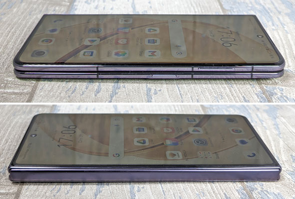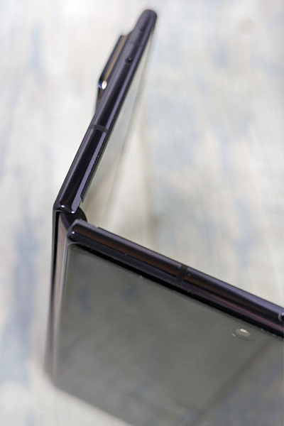 Lorsqu’on regarde le mobile de profil, depuis le haut ou le bas, on remarque que la charnière permet de faire coller les deux volets du smartphone, à la différence du Samsung Galaxy Z Fold4. Depuis, avec le Galaxy Z Fold5, le fabricant a revu sa charnière qui permet désormais d’avoir les deux volets collés. La charnière installée sur le Magic V2 est particulièrement robuste. Elle est un parfait exemple d’ingénierie et s’avère à la fois souple et ferme.