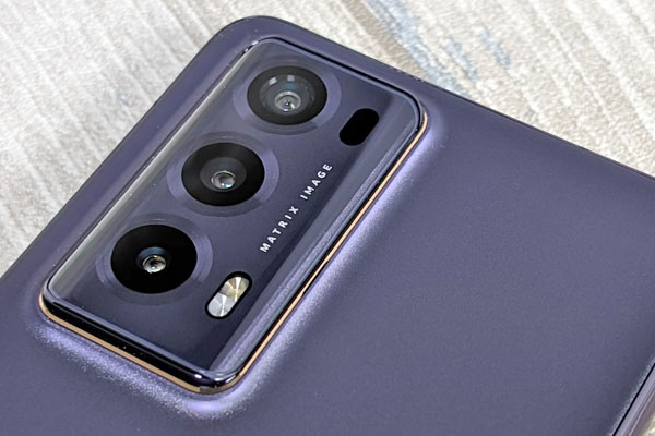 Dans le coin supérieur à gauche, il y a une plaque relativement épaisse qui accueille les capteurs photo. Pour conférer une impression de finesse, ses bords latéraux sont incurvés. L’ensemble est très joli et s’harmonise parfaitement avec le reste de la coque arrière. Le toucher est extrêmement agréable. Les trois capteurs photo sont alignés verticalement tandis que le flash et le capteur multispectral sont placés à côté. Exactement comme sur le Magic Vs, le côté gauche de la partie arrière est légèrement incurvé, proposant ainsi une excellente prise en main. C’est aussi le cas de l’écran externe, avec un côté incurvé, à droite.