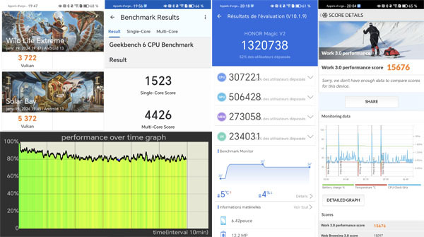 Comme tous les autres mobiles que nous avons pu tester, nous l’avons soumis à plusieurs outils de mesure de performances dont voici les principaux résultats. Remarquez que le processeur ne délivre pas toute sa puissance, préférant proposer 80% de son potentiel pour limiter les surchauffes. Effectivement, le mobile ne chauffe pas, même soumis à rude épreuve.