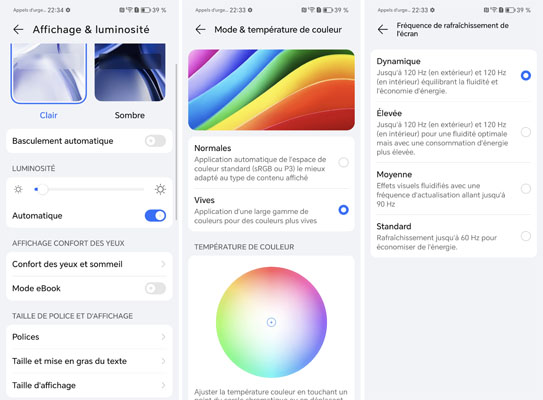 Notez qu’il est possible, pour les deux écrans, de choisir entre les modes d’affichage Normal ou Vif et de jouer sur la température de couleur pour obtenir une teinte plus chaude ou plus froide. Les réglages proposés par défaut sont parfaits. Le niveau est appréciable pour limiter la fatigue oculaire. Comme les autres mobiles haut de gamme de la marque, et certains plus abordables, on peut compter sur plusieurs fonctions pour atténuer la fatigue dont l’affichage nocturne circadien qui ajuste automatiquement la température de couleur de l’écran en fonction du rythme corporel afin de ne pas nuire à l’endormissement. Notez aussi une très forte gradation dynamique et tout autant pour la gradation PWM à ultra haute fréquence, de 3840 Hz pour ne pas avoir de scintillement.