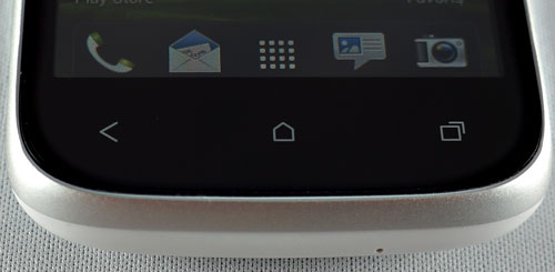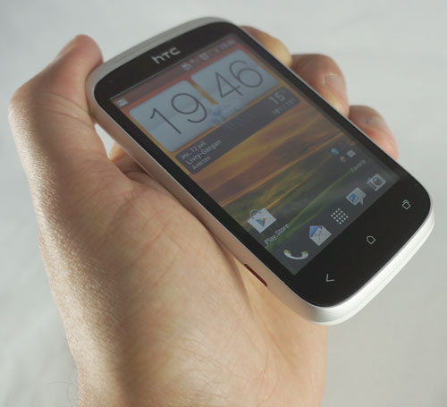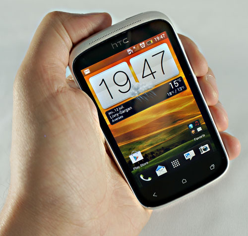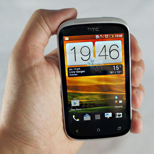 Au final, la prise en main du Desire C s'avère vraiment très bonne. Sa taille modeste lui permet de parfaitement reposer dans toutes les mains, mêmes les plus petites. Le rayon d'action du pouce couve sans problème l'ensemble de la surface de l'écran, ce qui implique que le smartphone est très facilement utilisable à une seule main. Il sait, de plus, se faire très facilement oublier au fond d'une poche ou à fortiori d'un sac.