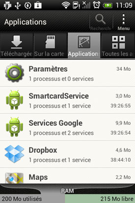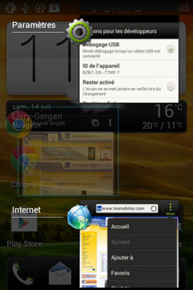 La première chose qui manque et qui va sauter aux yeux de ceux qui connaissent déjà cette interface est l'absence de la vue d'ensemble des bureaux d'accueil. De même, le gestionnaire d'applications récentes est celui que l'on trouve de base dans Android 4.0 ICS et pas celui qui a été retravaillé par HTC. Notez que cela ne constitue nullement une faiblesse à nos yeux dans la mesure où le gestionnaire pensé par Google est vraiment excellent. On apprécie également le fait qu'il soit activable directement depuis une des touches situées sous l'écran, et non par le biais d'un appui long. Pour enlever une application de cette liste, il suffit de la faire coulisser sur le côté. Notez que cette action ne ferme pas le processus de l'application mais la supprime juste de la liste en question.