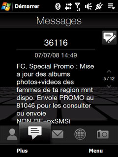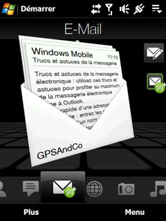L'onglet Email est original avec son affichage sous forme d'enveloppe mais le compteur de mails s'arrête à 99 mails non lus, dommage. A la manière de l'iPhone, on fait un mouvement de doigt vers le haut ou vers le bas pour se déplacer vers le mail suivant ou précédent. Et dés qu'on visualise le mail, on retrouve l'interface Windows Mobile.