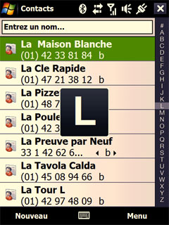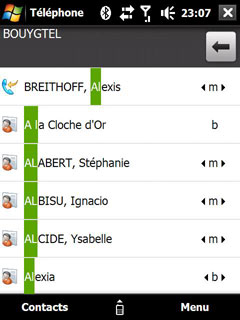 L'onglet Contacts permet d'accéder aux contacts favoris auxquels on peut associer une photo. On peut aussi accéder au répertoire avec un accès direct grâce aux lettres sur le côté droit de l'écran :