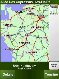 Ce logiciel n'est pas le plus rapide pour les calculs d'itinéraires, le Touch Diamond met 29 secondes pour calculer notre itinéraire de test de 500 Kms. A comparer aux 14 secondes nécessaires au très rapide Eten glofiish X500 (en Windos Mobile 6.0). Bon point, le recalcul d'itinéraire qui est instantané.