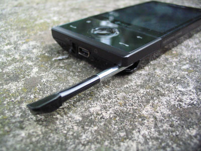 Le stylet est de bonne facture : il est en métal et très agréable à l'utilisation. Bon point, il n'est pas dépliable. Quand on enlève le stylet, on peut accéder au bouton permettant de réinitialiser (soft reset) le PDAphone en appuyant avec le stylet :