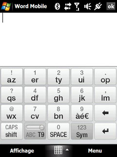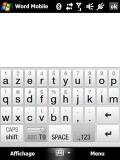 Le Touch Diamond propose, en plus des modes standards de saisie et du clavier virtuel de Windows Mobile, trois types de clavier différents, le clavier de type Téléphone, le clavier Azerty compact et le clavier Azerty complet. Ces claviers permettent de saisir au doigt. L'écran tactile répond bien et les claviers sont assez fonctionnels, sauf pour l'Azerty complet dont les touches seront un peu petites pour certains :