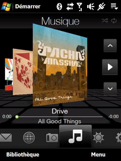 Mais l'ajout le plus intéressant, c'est l'interface HTC TouchFlo 3D qui est la principale innovation logicielle du Diamond. Cette interface tactile, développée par HTC, est une surcouche à Windows Mobile. Le design est très réussi et elle se manipule au doigt. En revanche, elle n'est pas toujours intuitive et à tendance à ralentir avec le nombre d'applications. Ceci dit, passé les premiers écrans du TouchFlo 3D, on retrouve les écrans Windows Mobile nécessitant le stylet. Cette interface est un plugin de l'écran Aujourd'hui et bon point, on peut la désactiver facilement.