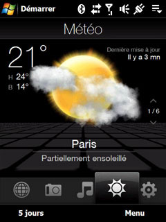 L'onglet Météo affiche le temps et les prévisions avec de nouvelles animations telles qu'un essuie glace qui s'affiche pour décrire un temps pluvieux :