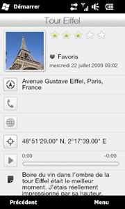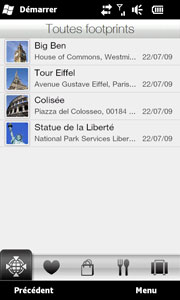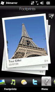 L'interface HTC Sense propose la fonctionnalité Footprints, ce sont des cartes postales multimédia que l'on crée directement avec le HD2 : on prend une photo qui sera géolocalisée avec sa position GPS et son adresse géographique. Et on peut lui associer un commentaire texte, un enregistrement sonore et un numéro de téléphone. Les FootPrints sont classés par catégorie : favoris, shopping, loisirs, restaurants ou autres et on peut les afficher sur une carte avec Google Maps et s'y rendre. On peut exporter chaque footprint au format KMZ mais dommage que l'interface HTC Sense ne soit pas liée directement avec un site de partage de photos géolocalisées comme Flickr ou Panoramio.