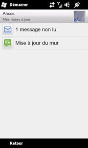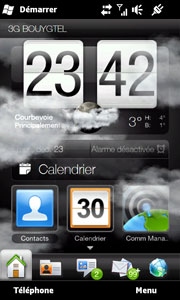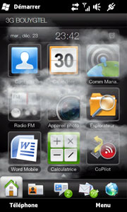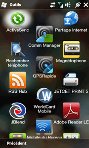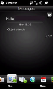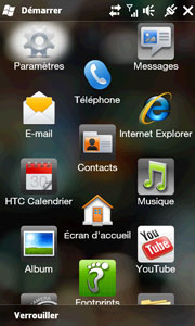 En plus de l'interface HTC Sense, celle de Windows Mobile est toujours présente notamment pour accéder à toutes les applications installées. Il suffit d'appuyer sur la zone Démarrer en haut de l'écran ou d'appuyer sur le bouton physique situé en bas du mobile et avec le logo Windows symbolisé par une fenêtre. Bon point, on peut désactiver l'interface HTC Sense si on le souhaite.