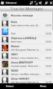 Pour consulter les SMS reçus, on les consulte un par un en faisant défiler au doigt. Ils peuvent aussi être consultés au travers de la liste complète de tous les expéditeurs de SMS :