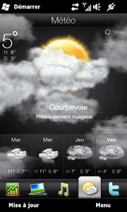 Au travers de l'interface HTC Sense, le HD2 affiche la météo sur un onglet dédié et également en fond de la page d'accueil, c'est très joli et il y a même des animations dont un essuie glace qui balaye l'écran par temps de pluie : très amusant.