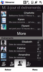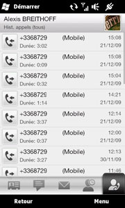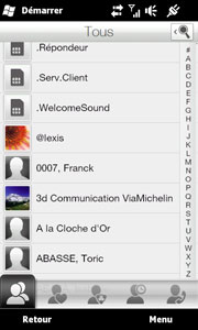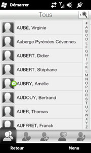 Le HD2 propose une gestion assez évoluée des contacts. Le répertoire propose la liste des contacts ainsi que les entrées de la carte SIM. Si on a un appel manqué, des SMS ou des Emails non lus pour l'un des contacts, une petite icône s'affiche avec le type de notification (appel, SMS ou Email) à côté de son nom :