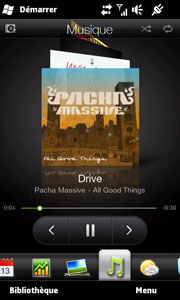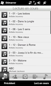 Pour la lecture de fichiers musique MP3, cela se fait depuis l'interface HTC Sense. On passe d'une chanson à une autre et la pochette de l'album, si disponible est affichée. On peut afficher toutes les chansons ou les trier par artiste, album, genre et même compositeur.