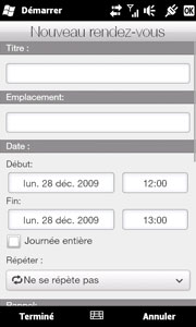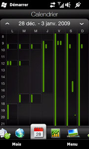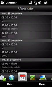 De même, au travers de l'interface HTC Sense, on accède au calendrier, assez bien fait et bien sûr synchronisable avec Outlook et Exchange. Comme sur la plupart des Windows Phones, le calendrier est pratique à utiliser et assez bien conçu.