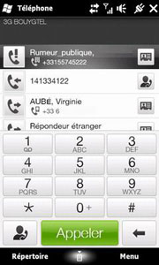 Pour la partie téléphonie, le numéroteur affiche de grosses touches et l'utilisation au doigt est très simple. On peut accéder directement au répertoire avec la touche en bas à droite, et même accéder directement à la fiche d'un contact en cliquant sur l'icône à sa droite. Ce smartphone intègre également un détecteur de proximité : ainsi dés que l'on approche le mobile près de son oreille, l'écran s'éteint automatiquement. Et il se rallume dés que l'on éloigne. Cela permet d'éviter les fausses manipulations de l'écran tactile en y appuyant son oreille. Autre fonctionnalité intéressante, quand le HD2 et qu'on le déplace, par exemple pour voir à l'écran qui nous appelle, le volume de la sonnerie est diminué, ceci afin de ne pas gêner l'entourage.