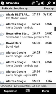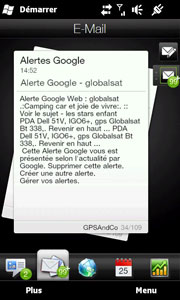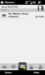 Comme tout smartphone Windows Mobile, le HD2 gère les mails en HTML ainsi que plusieurs comptes Email si besoin. Nouveauté de Windows Mobile 6.5, on dispose du push mail gratuit : pas besoin d'un service payant chez un fournisseur ou de serveur Exchange, il suffit de paramétrer un compte de messagerie Microsoft Hotmail. C'est bien sûr gratuit tout comme le push mail sur ce compte. La visualisation des mails peut se faire par l'interface HTC Sense ou l'interface standard de Windows Mobile, moins belle mais plus pratique pour les Emails.