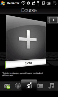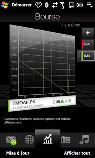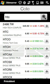L'onglet pour l'affichage de cours de bourse, est une nouveauté du Touch HD. L'ajout de cours de bourse à suivre se fait très facilement avec le moteur de recherche, il suffit de taper le nom de la société, ici HTC :