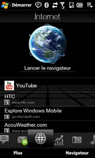 L'onglet Internet propose des raccourcis Internet pour visualiser Youtube au format WVGA (800 x 480 pixels) ou pour lancer Opéra :