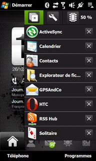 Indispensable sur un PDAphone Windows Mobile à la gestion de mémoire délicate (les applications ne se ferment pas et restent en mémoire), un gestionnaire de tâches est fourni par HTC. Il permet d'arrêter en deux clics une application :