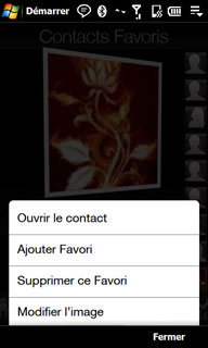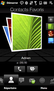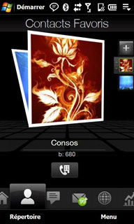 L'onglet Contacts permet d'accéder aux contacts favoris auxquels on peut associer une photo. On peut faire défiler les favoris au doigt et on peut appeler ou envoyer directement un SMS à un favori.