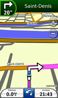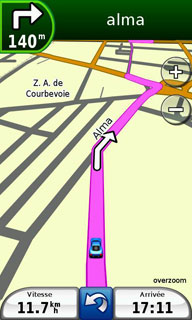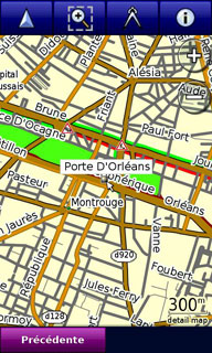 Comme la version 4, Garmin Mobile XT 5 est compatible avec la résolution WVGA (800 x 480 pixels) du Touch HD. Cela permet de voir « plus loin » sur la carte. Ce logiciel n'est pas le plus rapide pour les calculs d'itinéraires, le Touch HD met 25 secondes pour calculer notre itinéraire de test de 500 Kms. ceci sans connexion au serveur Garmin Online pour l'information trafic. Le recalcul d'itinéraire, avec 500 Kms restants à parcourir, est un peu lent mais cela reste acceptable.