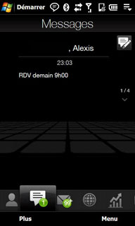 Est affiché en bas, le nombre de SMS non lus. Et on peut faire glisser les SMS au doigt. Bon point pour les menus du TouchFlo 3D qui sont de taille conséquente pour être facilement utilisés au doigt.