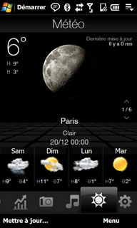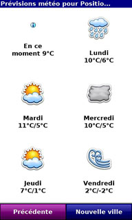 L'onglet Météo pour afficher le temps et les prévisions avec des animations amusantes comme un essuie glace affiché à l'écran par temps pluvieux. Et nouveauté du Touch HD, on a l'affichage également des 4 prochains jours en bas :