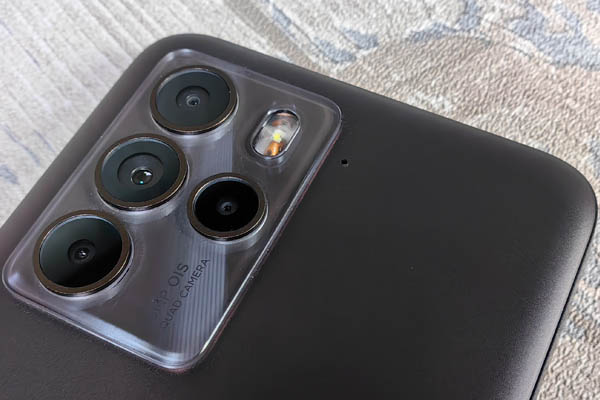 Le smartphone est décliné en blanc ou en marron. Ce dernier est assez foncé avec quelques beaux reflets selon l’angle de l’appareil à la lumière. Au dos, le revêtement propose un toucher particulièrement agréable. Les traces de doigts ne s’y attardent pas, ce qui est toujours une bonne chose. Toujours à l’arrière, il y a une plaque de la même couleur que le reste de la coque qui supporte les capteurs photo. Ceux-ci sont au nombre de quatre avec un flash relativement imposant par rapport à d’autres modèles que nous avons pu tester. Il y a trois cercles de même diamètre alignés verticalement avec le dernier capteur à côté. Notez également la présence d’un microphone, juste à côté de la plaque.