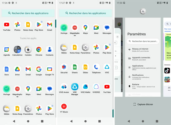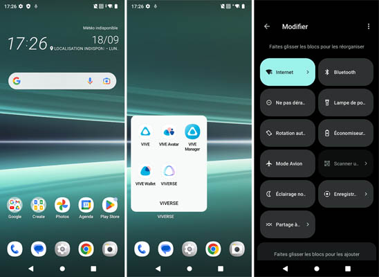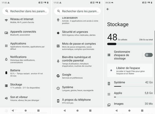 En plus des applications Google, quelques applications sont préinstallées : Vive, Vive Avatar, Vive Manager, Vive Wallet et Viverse, toutes en référence à l’autre activité de la marque, la réalité virtuelle. Si vous possédez un produit HTC qui correspond, vous pouvez ainsi retrouver certaines interactions via ces applications. Comptez sur un espace de 48 Go occupé sur les 256 Go théoriquement disponibles. C’est beaucoup même s’il y a pire sur le marché.
