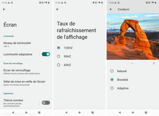 L’écran du HTC U23 Pro propose une diagonale de 6,7 pouces, soit plus que la concurrence à l’exception du Honor 90. Les bords sont nettement plus imposants que sur ce dernier qui profite des 4 côtés incurvés. Ici, le bord supérieur intègre une LED de notification, une fonctionnalité que l’on ne trouve plus sur les mobiles depuis quelques années maintenant. La définition de l’écran est de 1080x2400 pixels, comme la plupart des mobiles du marché. Il s’agit d’une dalle AMOLED, mais qui ne supporte pas le format HDR. Toutefois, il bénéficie d’une fréquence de rafraîchissement maximale de 120 Hz. La fréquence n’est malheureusement pas dynamique. Cela signifie qu’on peut la bloquer sur 60, 90 ou 120 Hz. Dans les paramètres, il y a plusieurs modes de couleurs : natural, boosted et adaptive. Objectivement, les différences entre les modes sont minimes et il faut avoir l’œil particulièrement bien entrainé pour observer des nuances.