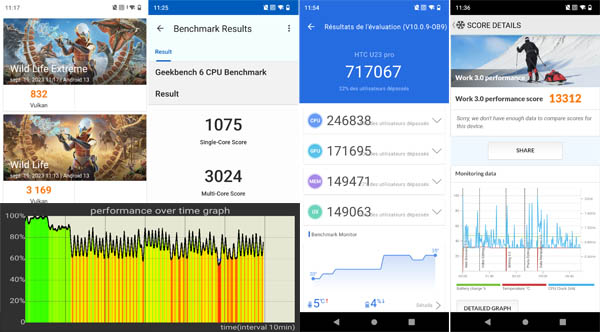 Comme tous les autres mobiles que nous avons pu tester, nous l’avons soumis à plusieurs outils de mesure de performances dont voici les principaux résultats. Remarquez que le processeur délivre toute sa puissance au début puis, après une douzaine de minutes, chute à 60% pour fonctionner en dent de scie jusqu’à la fin du test entre 60 et 80% environ.