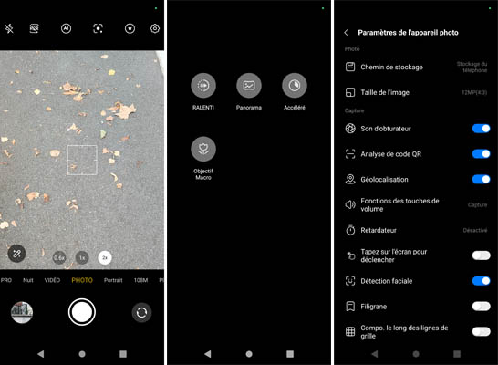 L’interface de l’application Appareil photo est très classique. Plusieurs options sont disponibles en haut de l’écran dont Google Lens. Dessous, il y a la zone de cadrage et plusieurs niveaux de zoom sont immédiatement disponibles au-dessus des différents modes de prise de vue : 0,6x, 1x ou 2x. Plusieurs modes sont immédiatement disponibles : Pro, Nuit, Vidéo, Photo, Portrait, 108M et Plus. Ce dernier menu permet d’accéder à d’autres modes : Ralenti, Panorama, Accéléré et objectif Macro. Il n’est malheureusement pas possible d’ajouter ces derniers modes aux autres déjà présents comme cela peut être proposé sur d’autres téléphones.
